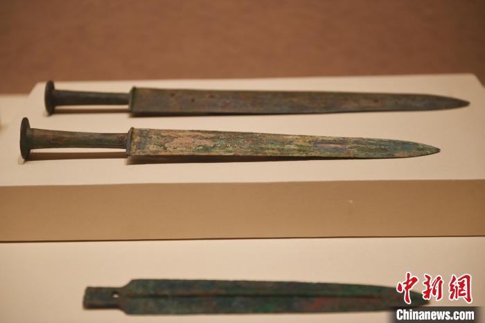 1月23日,甘肃省兰州市,甘肃简牍博物馆新年大展“塞防千里固家国——简牍中的长城岁月印记展”展陈的汉代铜剑。中新社记者 李亚龙 摄